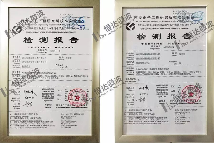 恒达微波已建成3个微波暗室:天线平面近场、远场测试复合暗室,天线远场测试暗室, THZ天线测试暗室。测试频率覆盖0.5GHz-110GHz;并已通过西安电子工程研究所校准实验室的计量检测。