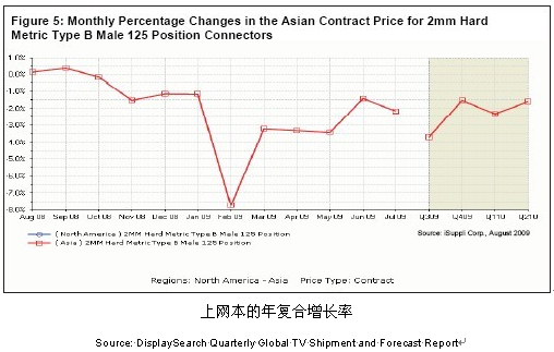 下图所示为亚洲每月连接器合同价格的百分比变动率,以代表市场趋势的未来四个季度预测。