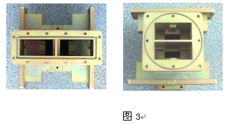 双变态魔T是将两个特殊的变态魔T及其调配件作成一个整体件。该特殊的变态魔T是将普通的魔T的两个平衡臂波导高度压窄,以便与波导PIN开关匹配。再将H臂折转90度,将E臂向另一方向折转90度形成H臂与E臂在一个传输方向。再将这两个变态魔T作成一个整体结构,使两个魔T的H臂在一个平面,并窄边相连;以便与H面电桥的输出直接相连;同时两个魔T的E臂在对面的一个平面,并宽边相连,以便与E面电桥的输入直接相连。四个平衡臂的输出分列在两边,以便与两个波导PIN开关相连。这样的变态使系统的连接紧凑方便、体积小巧,当然也给制造与调试增加很大的难度。特别是制造工艺的难度是相当大的。经过恒达公司电气、结构、工艺设计师和工人师傅的若干次研究、分析、分解和试验攻关,终于找到了一种行之有效的工艺方案使这一难题得到解决。