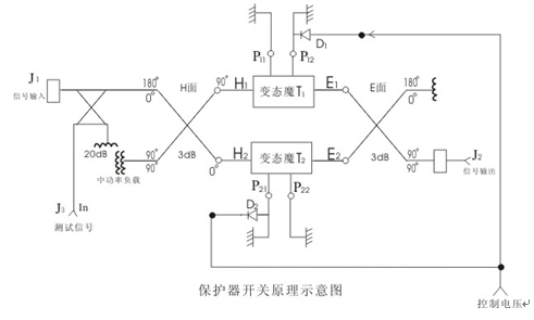 ·在发射脉冲停止时,同步的负压施加到PIN二极管上,从天线接收到的微波信号由J1输入,经过H面3dB电桥,被分成两个幅度相等,相位相差90°的两个信号,分别被送入两个变态魔T的H1臂和H2臂。进入H1(或H2)臂的信号,又二分为四到变态魔T的P11、P12臂和P21、P22臂,分别与两个波导二极管开关座相连接 。由于开关座里PIN二极管处于负偏置(或0偏置),开关座两臂A和B的反射波相位差180°。四个反射波信号分别在E1和E2相加,并进入E面电桥。由于相位关系,它们在J2输出。这就相当于整个开关处于通过状态。
